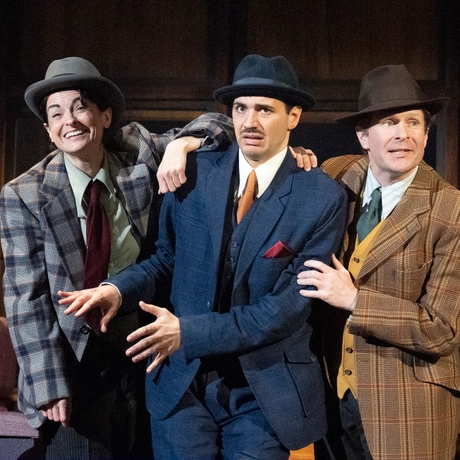 The set is an illusion of simplicity consisting of one piece of furniture that constantly evolves, an armchair and a backdrop of linen fold panelling disguising hidden doors and sliding portals allowing the actors movement around the stage, changes of character and costume. A bed is produced at one point and hilarious puppets piloting two airplanes and policemen seemingly chasing our hero.